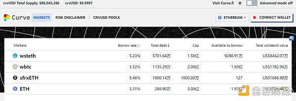 目前,铸造 crvUSD 的抵押品主要是 sfrxETH、wstETH、WBTC、ETH。其中,抵押品中占最高的是 wstETH,在所有抵押品中占据了 60% 以上的份额,总价值约 8420 万美元。
