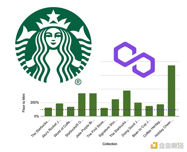最新系列(The Green Apron)发行价格为 100 美元,因存在铸造资格标准,意味着这些NFT在二级市场上存在溢价,目前铸造已结束,地板价为 115 美元。(注:星巴克将于8月2日在NFT市场Nifty Gateway推出经典“绿围裙(Green Apron)”NFT系列,于北京时间8月2日0点向满足条件的Odyssey会员开放,8月2日3点向公众开放。该系列共有5000枚NFT,基于Polygon发行,每枚NFT售价为100美元。)