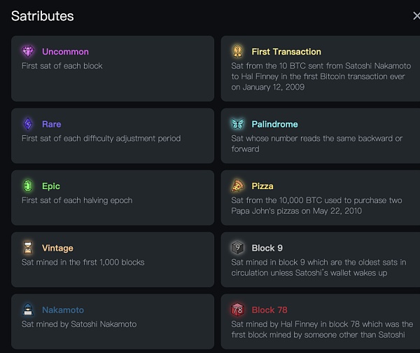 除了上述分类,一些具有历史意义,特殊字符等一系列聪,都被追捧。说白了,就是找聪与其他聪的特殊性。和玩ENS域名相同的思路,三字、四字、回文、一些特殊意义的域名因为稀缺性,价格贵。具体如何玩,感兴趣的可以自行找资料查询。