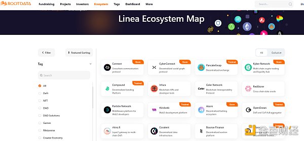 根据 Rootdata 数据显示,Linea 生态项目共有 71 个,包括已部署的借贷应用 LineaBank、DEX 平台 FWDEX、跨链兑换聚合器 XY Finance、跨 Rollup 链 Owlto Finance、NFT 市场 Zoni 等,还包括正在迁移部署的 Aave、Airswap、Sushiswap、Pancakeswap 等主流 DeFi 应用。