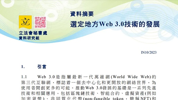 两个月前,香港证券及期货事务监察委员会正式落实虚拟资产服务商新发牌制度,开拓Web3.0领域新征程;香港立法会秘书处资料研究组在近期发布的《选定地方Web3.0技术的发展》中表示,推动Web3.0发展的基础是一系列先进技术和相关应用,包括区块链技术、智能合约、虚拟资产(例如加密货币)、NFT(非同质化代币)和元宇宙技术。