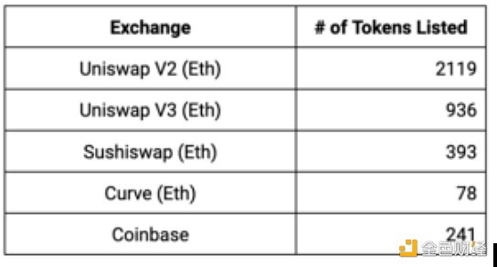 Uniswap控制着绝大多数长尾流动性。根据CoinGecko的数据,Uniswap拥有主要以太坊交易应用程序中最多的代币上市量。