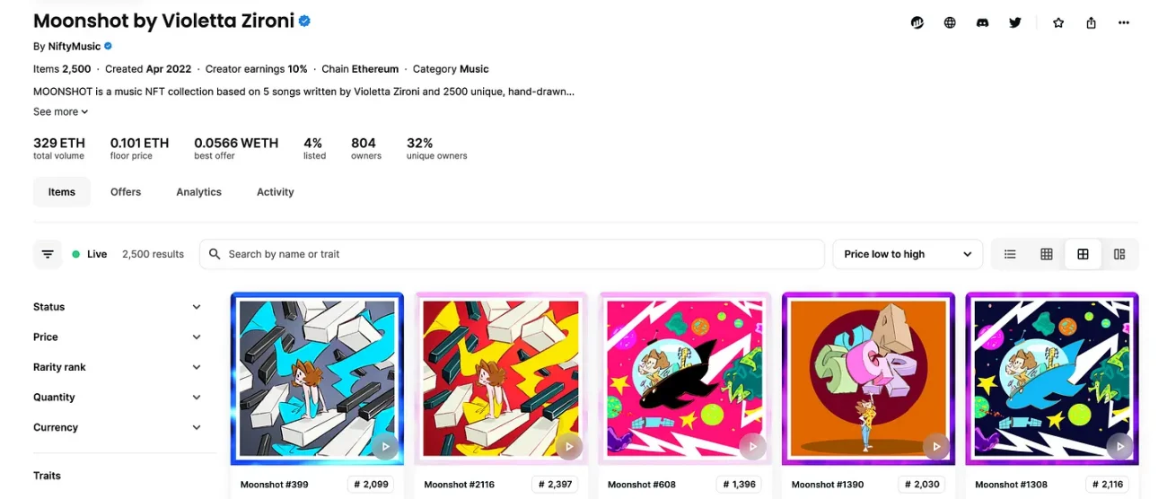 意大利音乐人 Violetta Zironi:2022 年 4 月,基于其创作的 5 首歌曲和其父亲 Giuseppe Zironi 绘制的 2500 幅独特手绘艺术品,发行了名为 Moonshot 的音乐 NFT 集合,总量 2500 个,单价 0.045 ETH,获得了 112.5 ETH(约 20w 美元)的收入。以此为灵感,她在 2023 年 1 月再次推出名为 Another Life 的音乐 NFT 集合,基于其创作的 5 首歌曲的 PFP, 总量 5200 个,单价 0.1 ETH,获得了 520 ETH (约 100w 美元)的收入。她也是第一个突破单个音乐 nft 销量 5000 的音乐人。