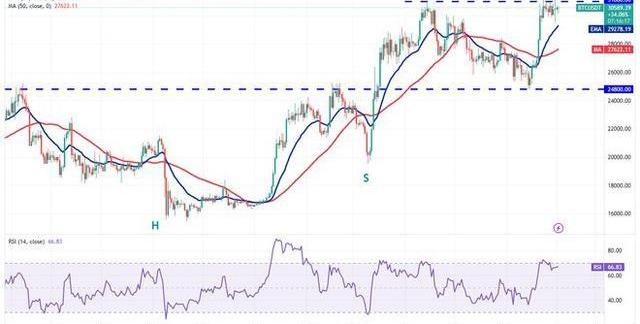 两条移动平均线均已趋于平缓,RSI接近中点,表明供需平衡。一段时间以来,价格一直徘徊在31,431美元至29,500美元之间。