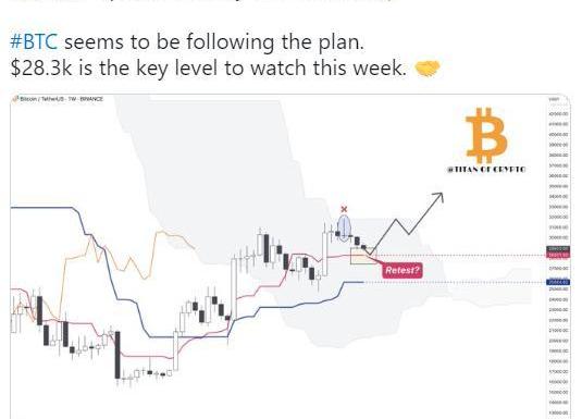 受欢迎的加密交易员Titan将28,300美元描述为未来一周的“值得关注的水平”。