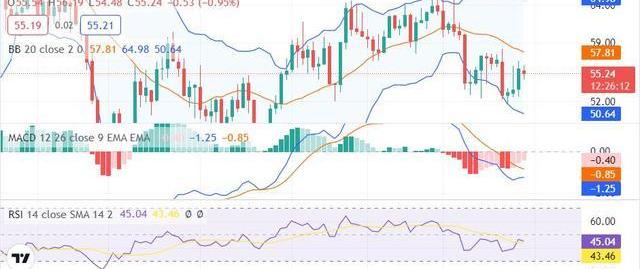 4小时MACD线位于信号线上方,接近进入正区域。这表明随着价格继续走高,市场的看涨势头正在增加。RSI指标目前为63,这表明市场在短期内还有上涨空间。上布林带为57美元,下布林带为53.5美元,这表明价格接近布林带中线。