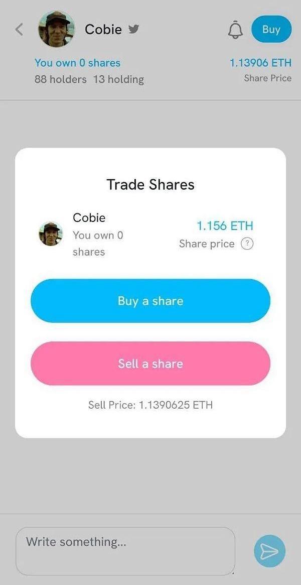 当你在friend.tech上购买他人帐户的股份时,你会自动获得与该帐户所有者及其其他利益相关者的私人聊天室的使用权。你还可以沿着应用程序的原生联合曲线系统对买到的股份进行销售,有时价格高于你最初买入的价格,有时则低于你最初买入的价格,具体取决于最近的交易活动。
