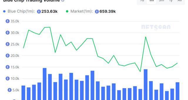 一个月内蓝筹NFT成交量趋势和所有收藏品成交量趋势如下所示。22日开始市场NFT交易交易额呈较明显的下滑走势,5月2日有回光返照但总体交易额比较冷淡。NFT市场总交易额为659.39kETH,蓝筹NFT的总交易额为253.63kETH,占比重也是很大的,依旧主导NFT市场。