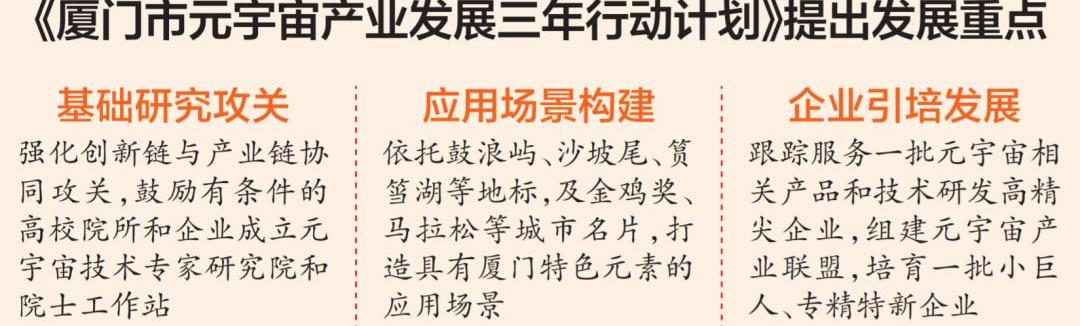 立足厦门实际,抢抓数字经济和元宇宙发展新机遇,打造“元宇宙生态样板城市”和数字化发展新体系,打造一个高端研究平台、开发一批特色应用场景、培育一批优质企业、培养一批创新人才、组建一个产业联盟、制定一批行业标准。