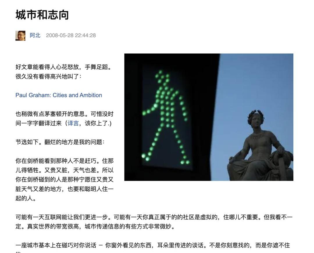 阿北写道:“好文章能看得人心花怒放,手舞足蹈……也稍微有点茅塞顿开的意思。”有读者在底下留了这么一句话,“虚拟社区帮助城市这样的高带宽社区分担一部分带宽,这个价值就蛮大的。”