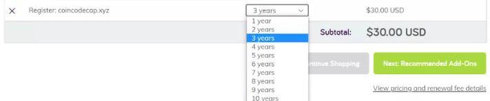 第4步:选择您希望域名注册的年限,然后查看注册域名的大致费用。
