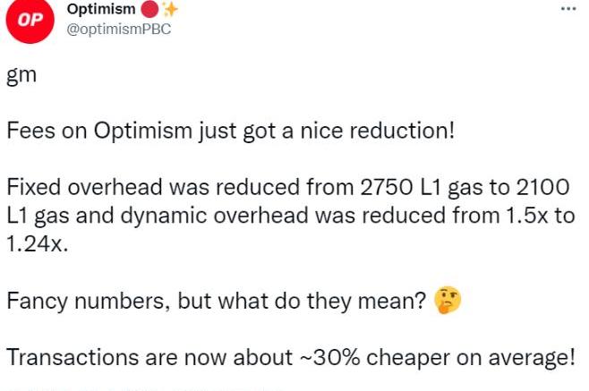 原文标题:《TheRoadtoSub-dollarTransactionsPart1、2:SlashingFeesby30%》原文来源:OptimismPBC官方Medium原文翻译:ETH中文微信公众号译者注:1月份,Optimism发推更新其Rollup的固定开销(Fixedoverhead)从2750gas减少至2100gas,动态开销(FeeScalar)从1.5倍降低到1.24倍;3月份又发布更新,称将对交易的calldata进行一次系统级别的压缩。而这一系列调整与更新将会给Optimism的开销带来极大的变化,进而影响用户的交易费(交易费平均减少30%-40%)。这些收费部分在Optimism的运作中分别扮演什么角色?本文先整体介绍了Optimism开销的组成部分,然后再分析对这些组成部分的调整如何影响用户的交易手续费。??