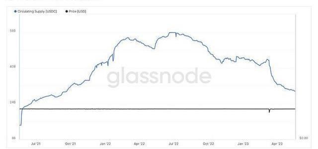 而和交易所里的资金存量也在继续下降,USDT抽离的速度虽然不是很快,但也已经要跌破2022年6月初的存量,而USDC已经是近两年的最低点了,而且还在继续抽离。