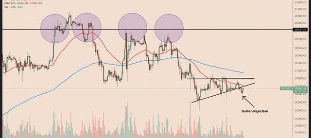 值得注意的是,自5月11日以来,BTC价格一直在收窄的上升三角形区间内波动,水平阻力位在27,500美元左右,上升趋势线支撑位目前在26,890美元附近。
