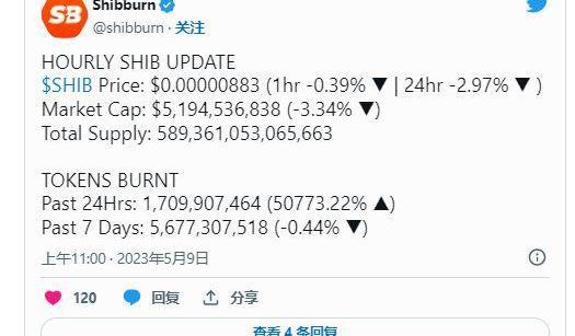 Shibburn.com信息称,代币投资者在过去24小时内销毁了1,699,451,700SHIB。这个巨大的项目在过去24小时内将SHIB的整体销毁率提高了12199.82%。