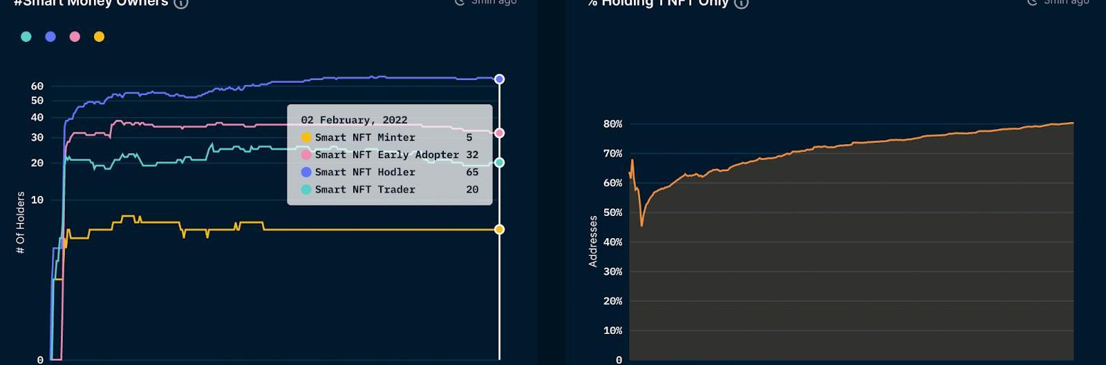 随着每天发布NFT项目的数量,几乎不可能跟上所有这些项目。一种策略是追随精明的资金并关注引起他们兴趣的项目,NansenNFT仪表板可以帮助实现这一点。您可以在“NFT大神模式”查看特定项目的交易数据,在“MintMaster”上查看铸造数据,并在“NFTSmartMoney”上查看过去24小时的SmartMoney活动概览。