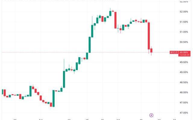 这种最大的加密货币此前几乎占总量的52%,一夜之间跌破50%,跌至接近一个月低点。