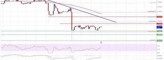下一个主要支撑位在0.0580美元附近。如果下行跌破0.0585美元支撑位,价格可能会进一步下跌。在所述情况下,价格可能会跌至0.0554美元的水平。