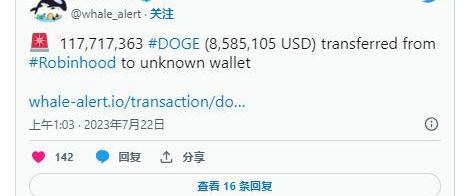 与此同时,一个未知的加密钱包从Robinhood收到了价值858万美元的117,717,363DOGE。