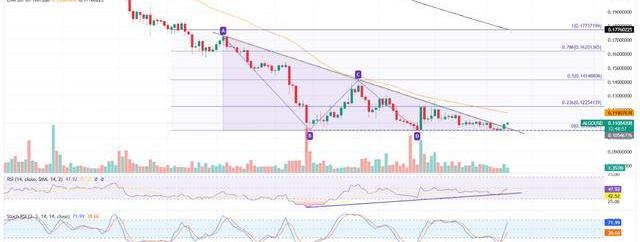 ALGO较历史高点3.28美元下跌了96.62%。然而,0.10美元心理关口的巨大买盘压力带来了坚实的底部支撑。山寨币价格走势已形成下降三角形模式,并受到50日均线和阻力趋势线的持续阻力。然而,从0.10美元关口的多次反转以及与RSI线的看涨背离最终导致看涨突破。