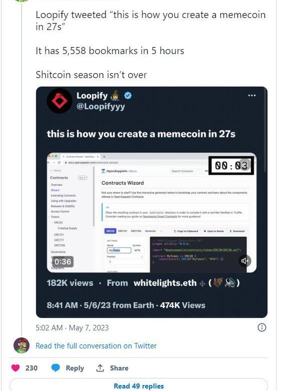 推特粉丝数超过12万的币圈KOLThreadGuy也表示,Loopify分享的影片在短时间内,就有大量的人加入书签,暗示了「垃圾币的季节尚未结束。」