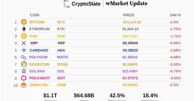 在过去24小时内,截至美国东部时间07:00,比特币下跌1.9%至24,144美元。其市场支配地位从42.7%降至42.5%。
