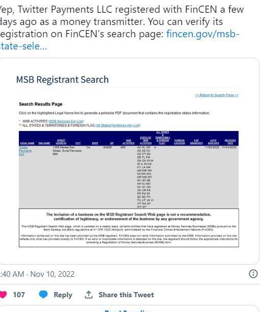 TwitterPaymentsLLC于2022年11月4日注册并提交了作为汇款人的申请。该申请称,Twitter计划在美国及其几个国际领土开展货币服务。