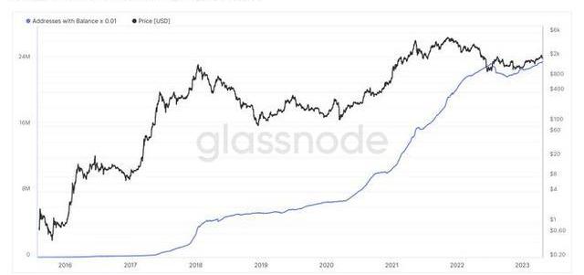 Glassnode的数据显示,持有0.01个或更多硬币的地址数量一直在稳步增加,截至撰写本文时,这一数字已超过2370万。