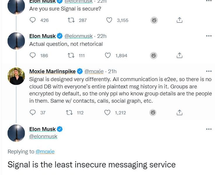 对此,马斯克表示自己并不认同MoxieMarlinspike的观点,并质问他“是否确认Signal是安全的?”MoxieMarlinspike回复称,Signal所有通信都是e2ee,默认群组也是加密的。马斯克随后表示,Signal是最不安全的消息服务。