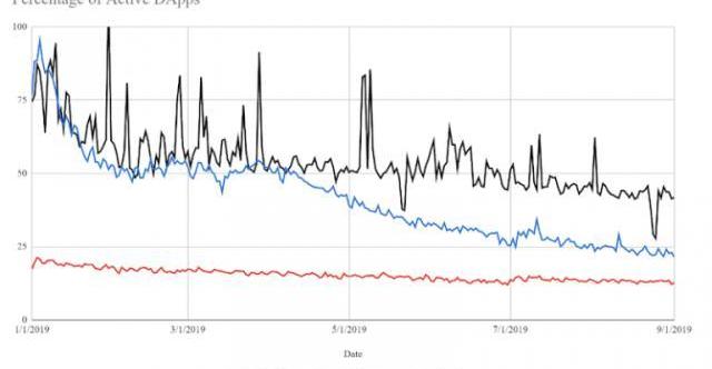 我所说的“DApp健康度”是一个百分比的指标,它是根据任意时间点激活的DApp和所有DApp数量的对比得出。我将这些数据解释为: