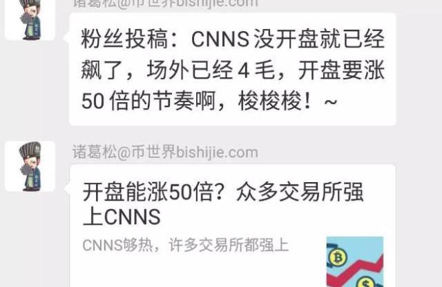 而在接踵而至的问题中,引起轰动最大的就要数币世界和比特儿发行的CNNS了。在这里,可能有很多朋友要问:作为一个土生土长的媒体,真的可以发币吗?其实,在很久之前币世界就发行过一款叫做BSJ的币,后来由于政策原因,就跑到韩国做了一个可以跟BSJ进行1:1兑换的CNNS。今年,IEO大潮席卷币圈。币世界便和比特儿一拍即合,搞起了合作。上线比特儿之前,币世界旗下的一众分析师疯狂鼓吹CNNS,利用“开盘50倍”、“梭哈”等字眼,引诱散户踊跃接盘。