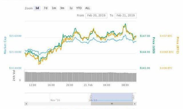 目前,大多数加密货币的交易情况喜忧参半,莱特币和EOS都上涨了5%以上,而其他加密货币则略有下降。ETH目前的价格为147.3美元,交易价格略有上涨。过去7天,ETH价格大约从120美元的低点大幅攀升。在上周上涨之前,ETH经历了另一轮的上涨,从103美元的低点升至120美元。