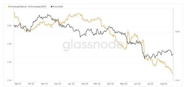 在7月中旬出现上涨后,BTC在交易所的余额获得了向南的势头,并达到了四年来的最低点,尽管近期价格走势很大。
