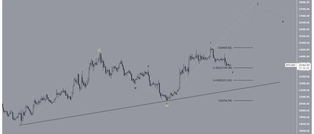 由于这似乎是1-2/1-2波的形成,因此在上升支撑线下方的下降和0.618Fib回撤支撑位在22,230美元将使这一计数无效。