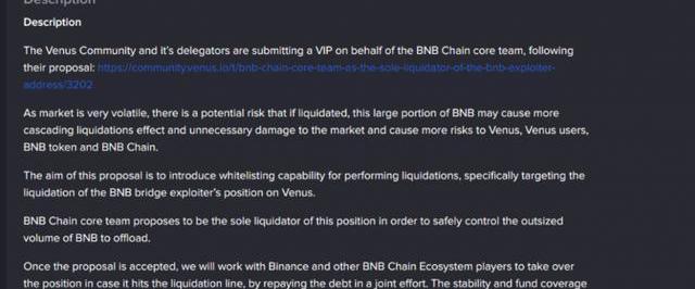 2022年11月,Venus项目批准了BNBChain的VIP-79提案,授予该组织独家清算BNBBridge事件背后攻击者头寸的权利。Venus的Discord渠道经理Dominik证实,BNBChain团队将接管该仓位并逐步平仓,以确保不会影响币价。
