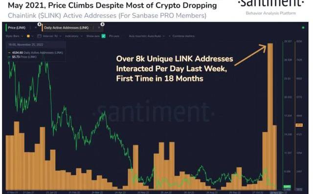 LINK在熊市中脱颖而出的原因是,尽管比特币和以太坊价格下跌,但周一Chainlink价格上涨。Santiment数据强调,更大的故事是LINK的活跃地址突然激增,这大约是在FTX后果发生时开始的。