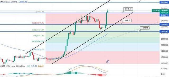 从技术角度来看,比特币最近突破了重要的双顶阻力位24,300美元。当前高于该水平的收盘蜡烛增加了BTC继续看涨趋势的可能性。至于直接阻力位,比特币目前面临25,450美元和26,000美元的阻力位。