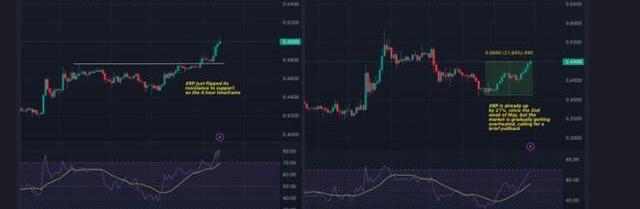 在技术方面,XRP成功地突破了阻力位以支持4小时的时间框架。如下图所示,0.475美元的关口阻碍了资产价格自5月中旬以来的上涨。然而,事情似乎对XRP有利,因为它现在已经变成了支持。
