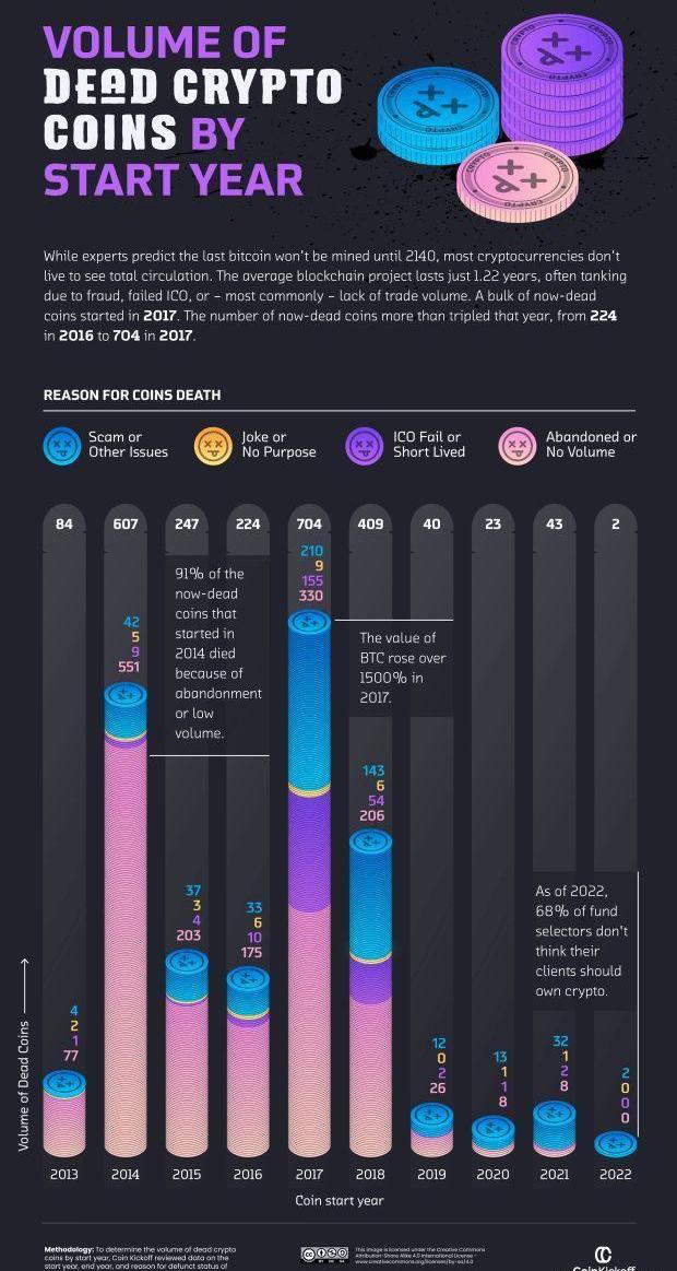 CoinKickoff最近的报告展示多年来各种山寨币项目的失败,以及比特币如何成为杰出的幸存者。根据他们的数据,2014年加密货币市场崩盘时出现的硬币中,有91%现在已完全废弃。现在已经死亡的硬币中有很大一部分是在2017年创造的,当年创造704个现在已经死亡的硬币。加密货币历史上最致命的一年是2018年,在此期间有751个硬币失效。