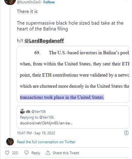 越来越明显的是,Gensler将以太坊视为一种证券。周一,当该机构对加密货币影响者IanBalina提起联邦诉讼时,它提出了一个更加极端的观点:根据SEC的逻辑,美国政府对所有以太坊交易拥有管辖权,因为大多数网络的验证节点聚集在美国