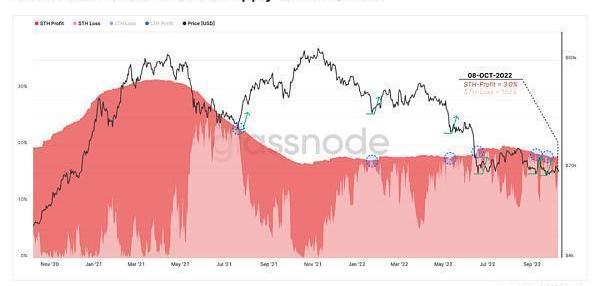目前,总流量比特币的18.1%来自短期持有人,其中15.1%持有未实现亏损。这使得STH仅持有3%的获利比特币,在经历了如此长时间的下降趋势之后,可能接近卖方疲惫的程度。