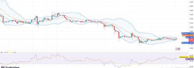 在过去的四个小时中,价格呈现出逐渐波动的趋势,表明缺乏波动性。目前,布林带上限为4.51美元,而布林带下限为4.37美元。RSI得分也有所下降,目前徘徊在中性区下半部分的46点。