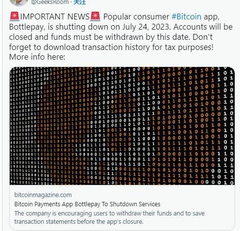 Bottlepay宣布关闭,敦促用户提取比特币和法定货币资金