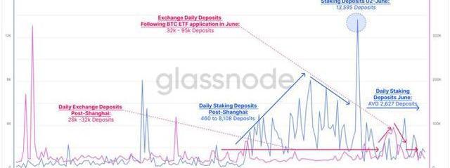 链上分析公司Glassnode在其最新报告中写道,自上海上线以来,质押合约的存款“更高,或与交易所流入的规模相当”,这表明更多的ETH被用于质押,而不是在交易所出售。
