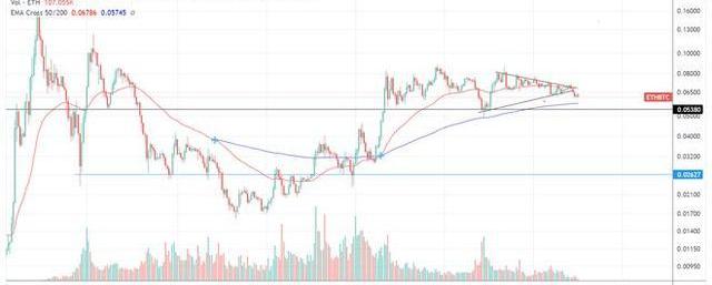 ETH/BTC货币对还表明,以太币还有进一步下行空间,接近0.0574BTC的200日移动平均线以及0.0538BTC的长期阻力位和支撑位。