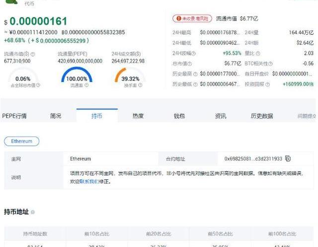 前100个最富有的PEPE巨鲸地址,控制着43%的代币流通供应,中心化严重。