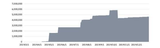 在2019年1月,去中心化交易所每月独立的用户数为34,244个,而金融应用程序独立的用户数为4,649个。在2019年期间,DEX的用户数量增加,并在2019年8月达到48,934人的峰值,之后回落到接近最初的水平,12月的用户数量为34,033人。另一方面,金融应用程序的用户数量自1月份以来持续增长。8月份,它的月度用户数量突破了1万。12月份,在以太坊上使用去中心化金融应用程序的独立用户数达到了25,925个。