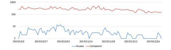 同样,Acueos是Compound协议的EOS实现。不幸的是,它还没有像Compound一样被广泛,如下表所示。