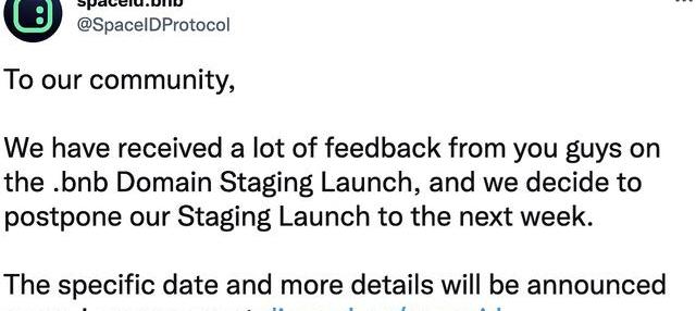 9月7日消息,全链域名服务商SPACEID在社交媒体上发文表示,由于收到社区关于.bnb域名阶段性注册的大量反馈,故决定将阶段性注册推迟至下周。此前消息,9月5日,全链域名服务商SPACEID发文宣布,.bnb域名将于北京时间9月13日13时开启公开注册。同时将于9月7日13时开始向公众举行为期5天的阶段性注册。