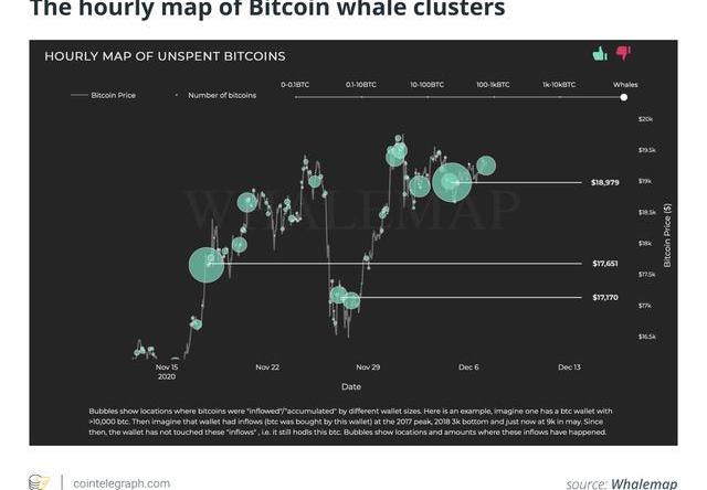 跟踪比特币鲸鱼活动的链上分析平台Whalemap上的鲸鱼集群也显示出类似的趋势。12月7日,Whalemap分析师表示,鲸鱼群显示三个近期支撑区域,分别为18979美元,17651美元和17170美元。